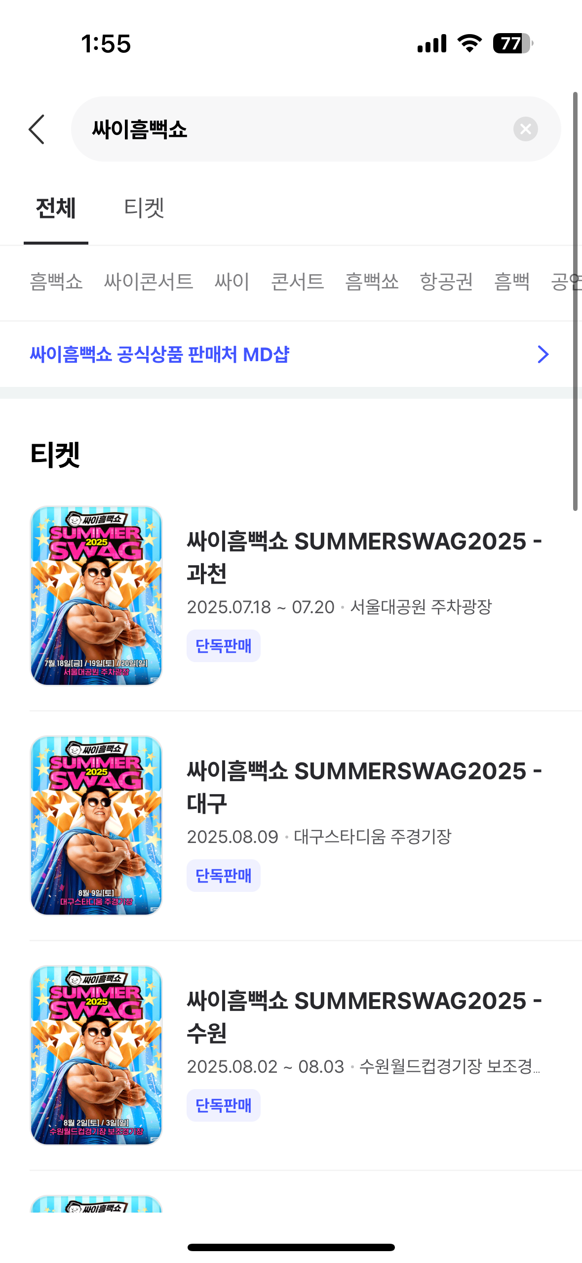 - 인터파크 티켓에서 ‘싸이 흠뻑쇼 2025’ 검색.