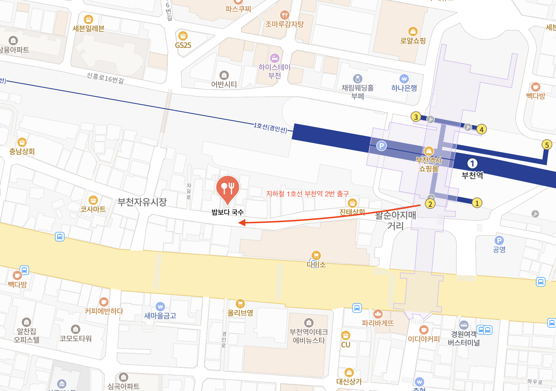 부천 심곡본동 중심에 위치해 대중교통 접근성도 뛰어납니다. 인근에 자유시장, 소사역 등이 가까워, 시장 구경 겸 국수 한 그릇 하기에 좋은 코스입니다.